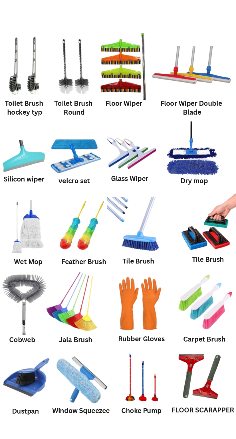 Their cleaning accessories include Rubber Gloves, Dustpans, Floor Scrapers, Silicon Wipers, Window Squeezees, and Yellow Dusters.